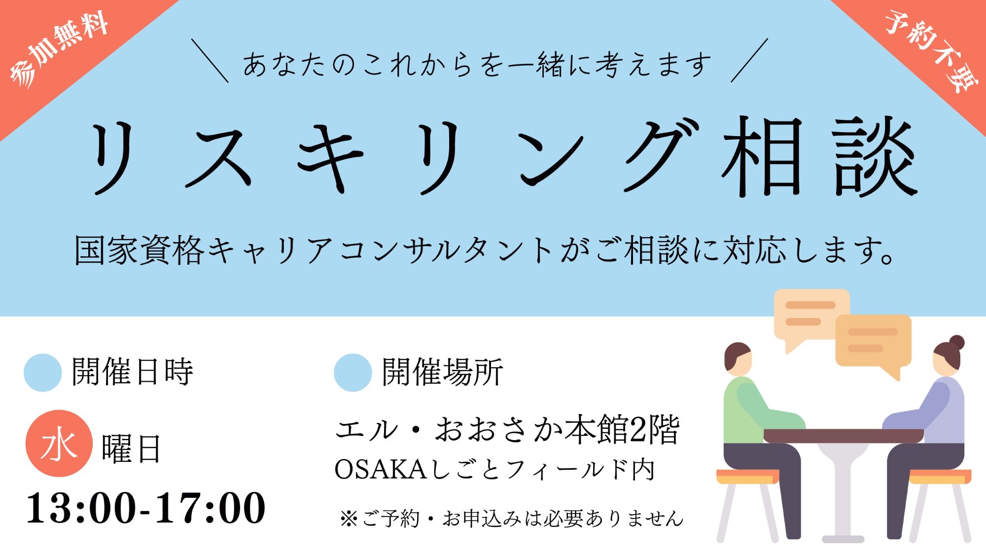 OSAKAしごとフィールドの受付にて「リスキリング相談希望です」とお伝えいただき、お気軽にご来場下さい。